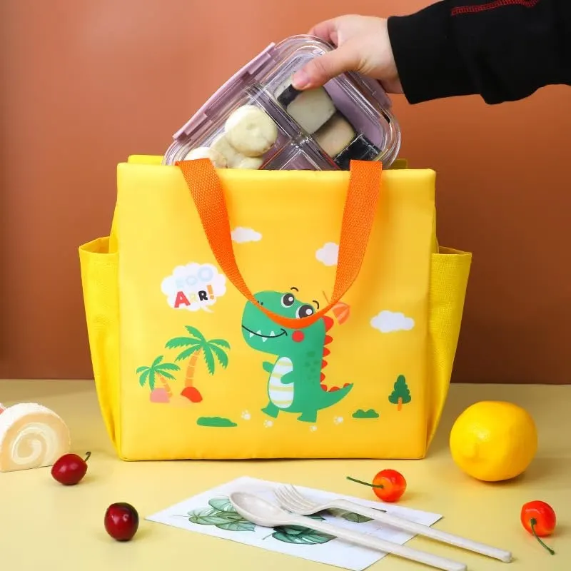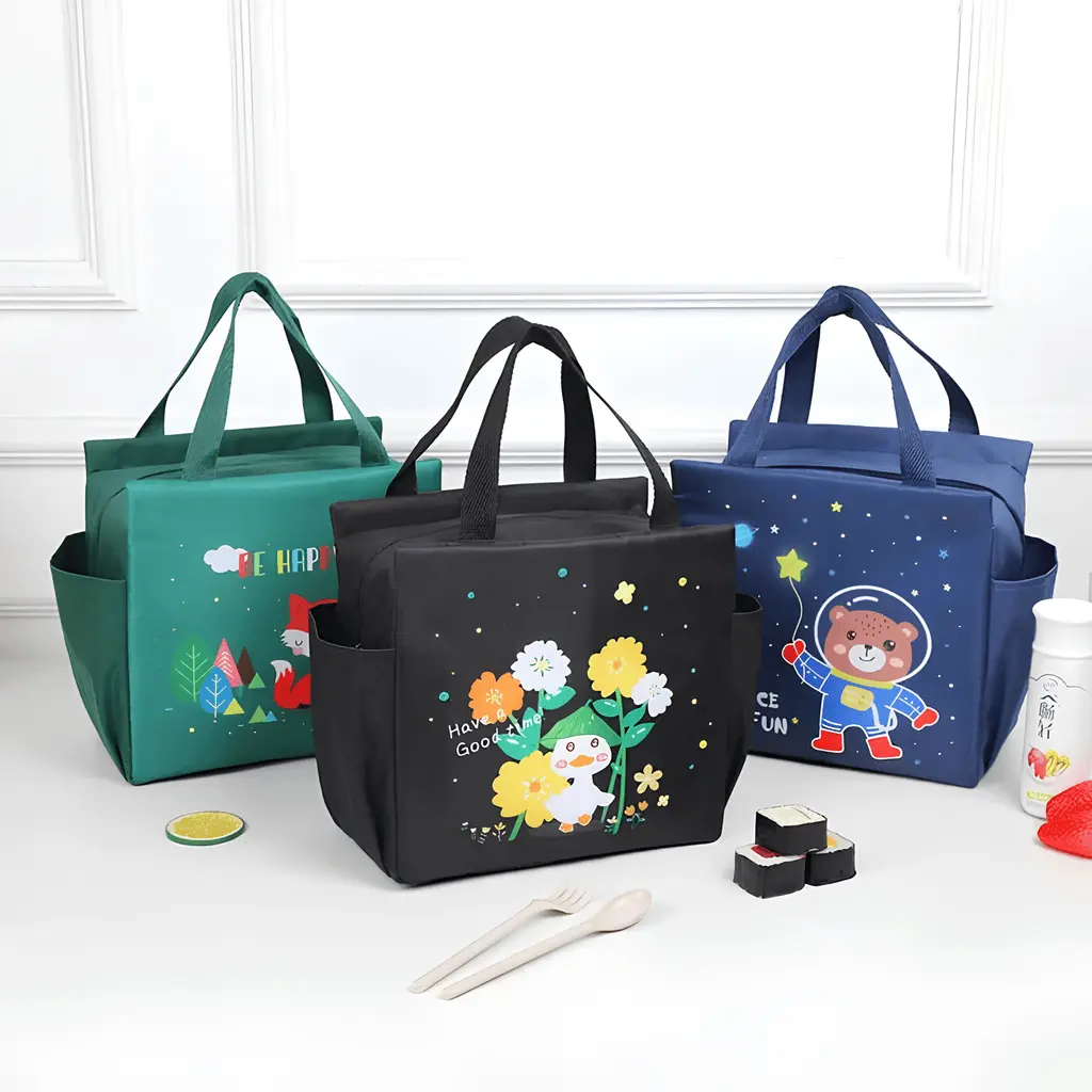 This Big Insulated Lunch Bag comes in a variety of delightful designs, including playful unicorns, cute astronauts, charming foxes, and friendly dinosaurs (as seen in the images), making mealtime more fun. Its generous size offers ample space for lunch boxes, snacks, fruits, and a water bottle, while convenient side pockets provide extra storage for smaller items.